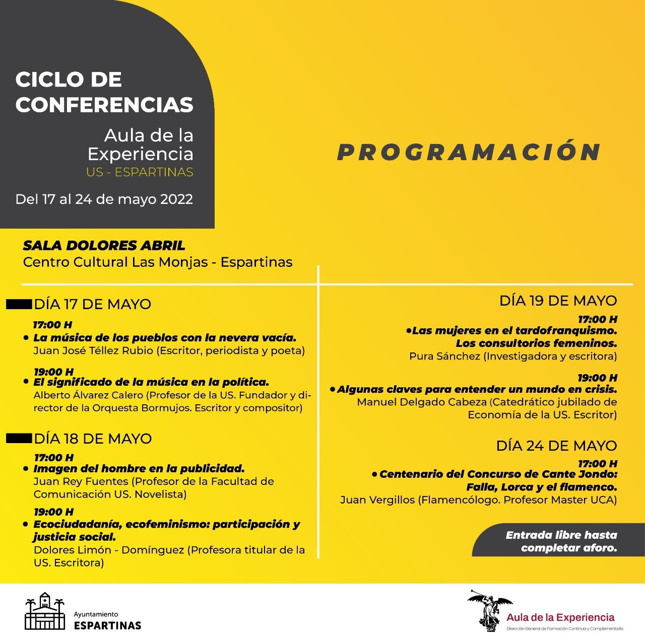 El Aula de la Experiencia de la Universidad de Sevilla con sede en Espartinas, con la colaboración del Ayuntamiento de Espartinas, ha organizado un ciclo de conferencias que se detallan en la imagen adjunta. Las conferencias tendrán lugar en la Sala Dolores Abril del Centro Cultural Casa de las Monjas de Espartinas (avenida Leal Castaño, sn).