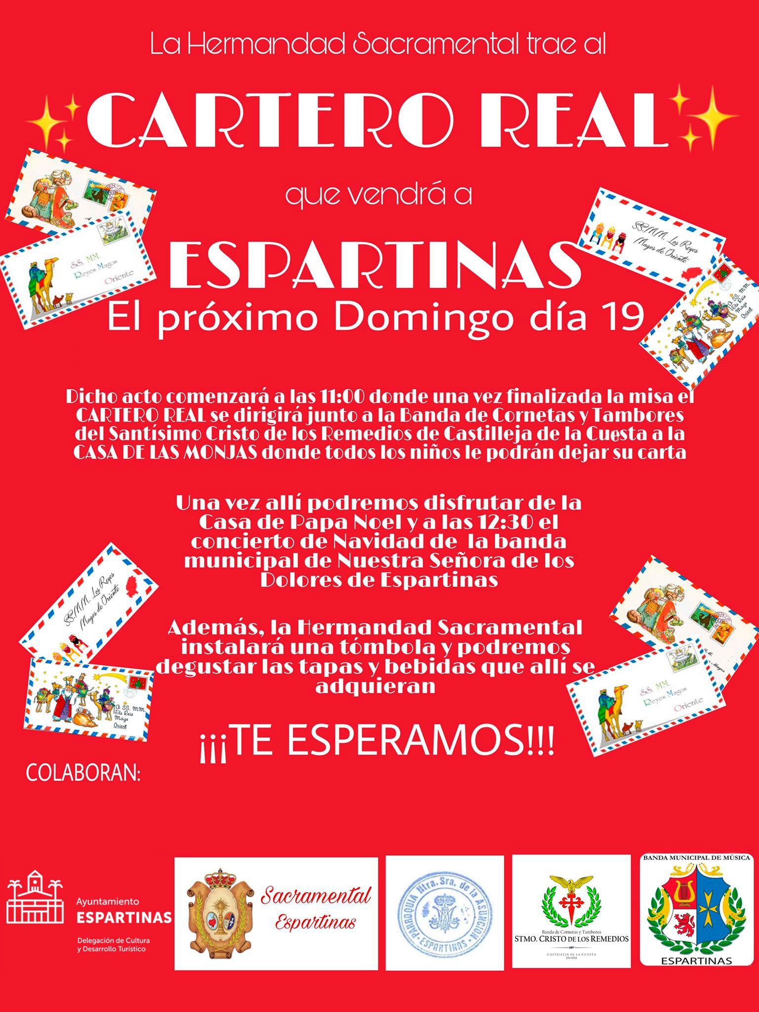 El Cartero Real espera a todos los niños y niñas de Espartinas el próximo domingo 19 de diciembre. El acto empezará a las 11.00 horas en la Parroquia Nuestra Señora de la Asunción, donde el Cartero Real caminará hacia el Centro Cultural Casa de las Monjas. Allí los más pequeños de la casa podrán dejar sus cartas para sus Majestades los Reyes Magos de Oriente.