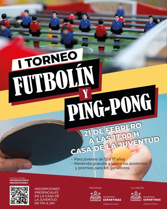 La delegación de Juventud del Ayuntamiento de Espartinas en colaboración con la delegación de Deportes han puesto en marcha este primer torneo de futbolín y ping-pong que se celebrará el 21 de febrero a las 17.00 h en la Casa de la Juventud.