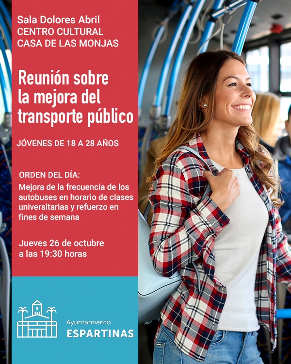 Jóvenes de Espartinas, queremos conocer tu opinión para mejorar el transporte público en la localidad. Si tienes entre 18 y 28 años te emplazamos a una reunión el próximo jueves 26 de octubre, a las 19.30 horas en la Sala Dolores Abril del Centro Cultural Casa de las Monjas.