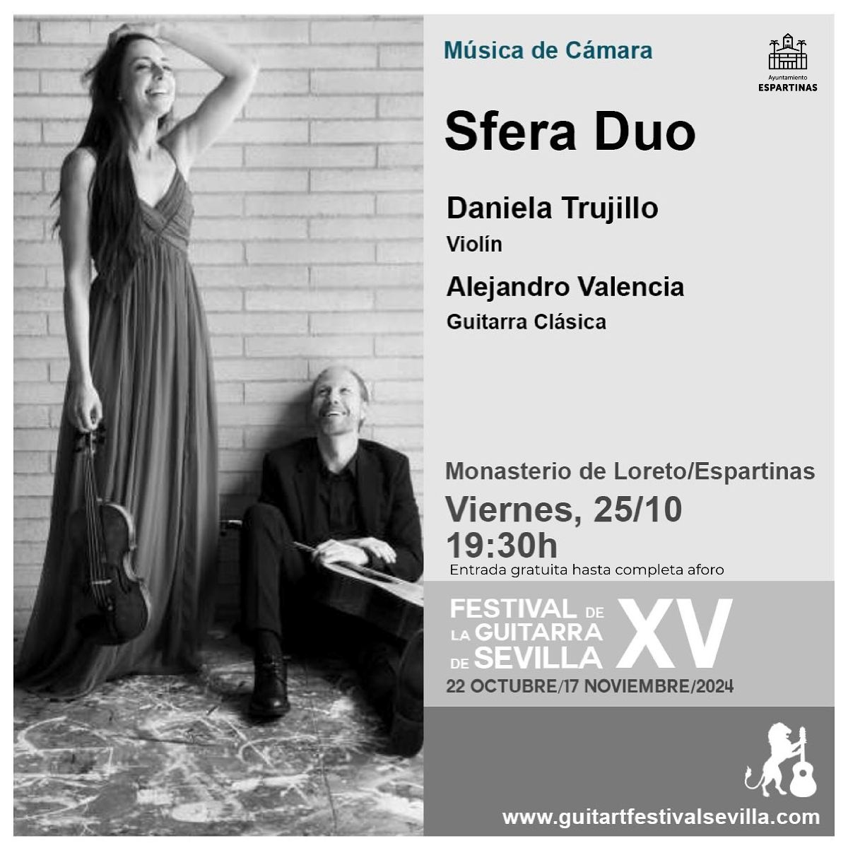 Por primera vez en las catorce ediciones del Festival de Guitarra de Sevilla, se celebra un evento fuera de la capital. El próximo viernes 25 de octubre a las 19:30 horas en el Monasterio de Loreto, se celebrará el concierto de Sfera Dúo, con Daniela Trujillo al violín y Alejandro Valencia, con guitarra clásica. Apúntate a esta cita histórica organizada por el Festival de la Guitarra de Sevilla , en colaboración con el Ayuntamiento de Espartinas.