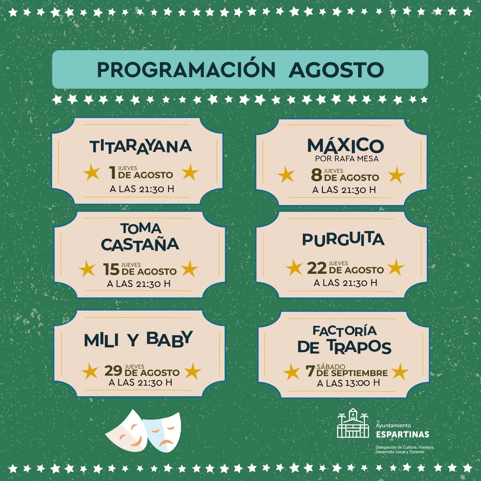 21.30 horas. No olvides traer tu silla, un bocadillo y disfruta que el teatro lo ponemos nosotros.