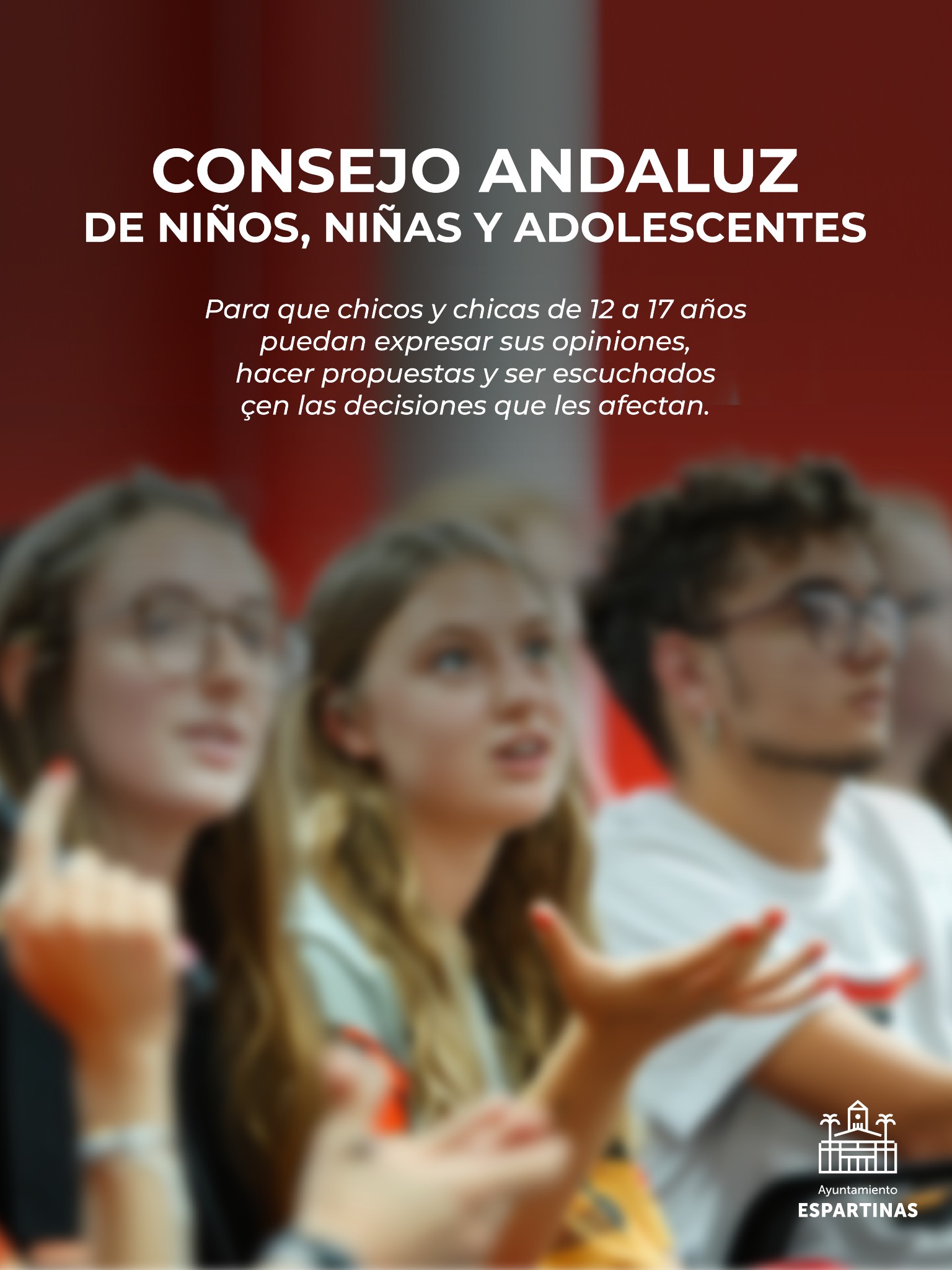El Área de Igualdad y Políticas Sociales del Ayuntamiento de Espartinas se une a la iniciativa propuesta por la Consejería de Inclusión, Adolescencia y Juventud de la Junta de Andalucía, que está impulsando la creación de un Consejo Andaluz de Niños, Niñas y Adolescentes, para que chicos y chicas de 12 a 17 años puedan expresar sus opiniones, hacer propuestas y ser escuchados en las decisiones que les afectan.