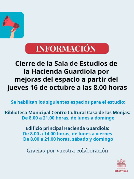 Se informa que mañana jueves 16 de octubre, a las 8.00 horas, se cerrará al público la Sala de Estudios de la Hacienda Guardiola debido a los trabajos de mejora de las instalaciones, con el arreglo de las paredes y su posterior pintado. Se habilitan los siguientes espacios para el estudio: