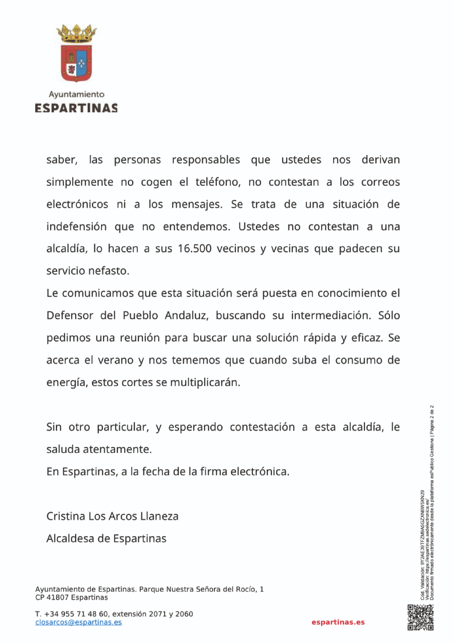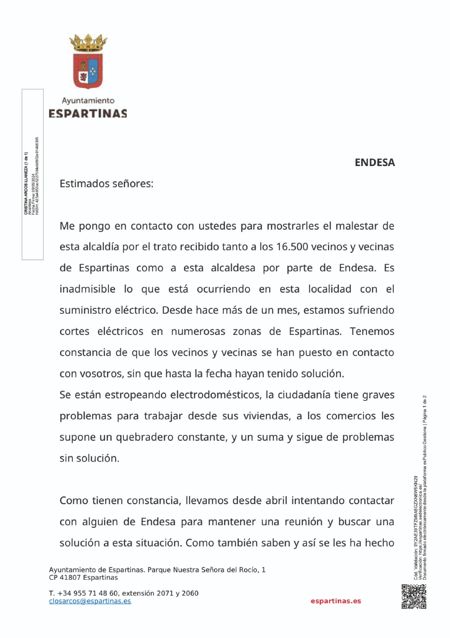 COMUNICADO DEL AYUNTAMIENTO DE ESPARTINAS A ENDESA ANTE LOS NUMEROSOS CORTES DE LUZ EN EL MUNICIPIO