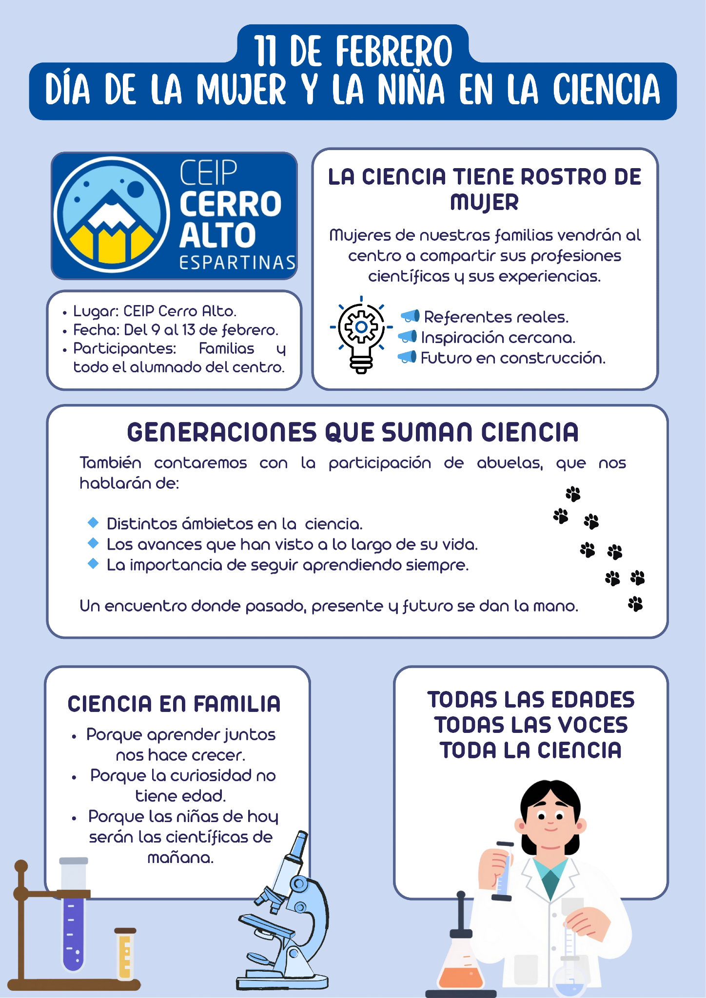 El Colegio Público Cerro Alto celebra el #11F Día Internacional de la Mujer y la Niña en la Ciencia con numerosas charlas y talleres relacionados con la ciencia y las ingenierías, que están siendo impartidas por padres y madres de nuestro centro con perfiles profesionales en el campo científico y tecnológico. Se están celebrando durante esta semana y están dirigidas al alumnado de infantil y primaria.Esta actividad queda encuadrada dentro del Programa STEAM que se viene desarrollando en el centro, cuyo objetivo es promover la curiosidad, el pensamiento crítico y la igualdad de oportunidades en el mundo científico.