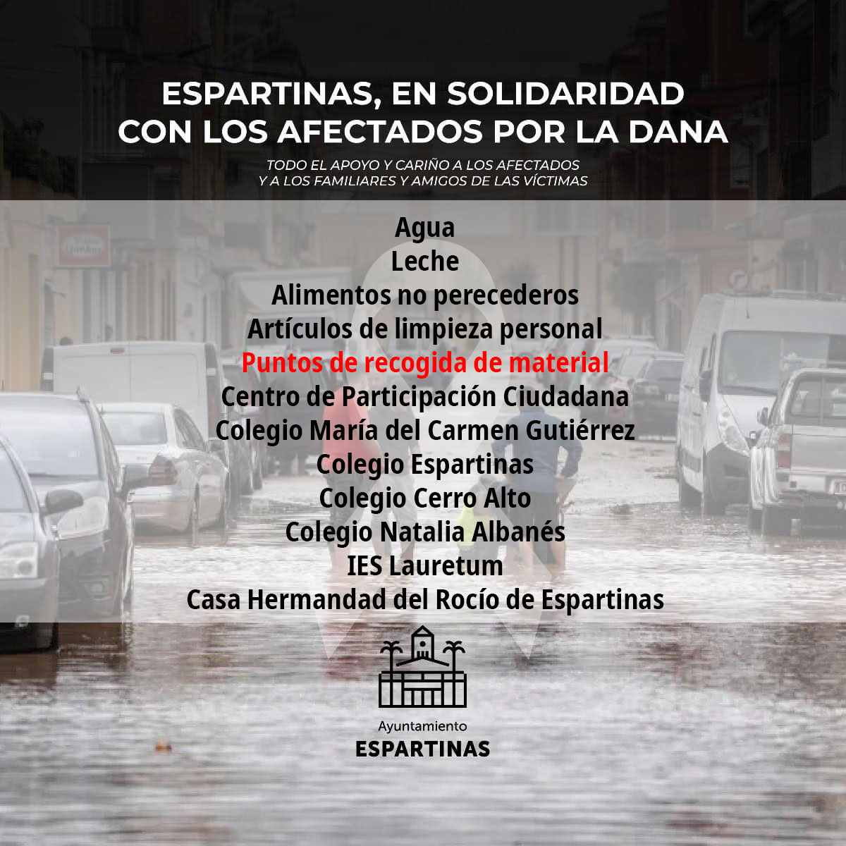 Los vecinos y vecinas que quieran colaborar con la recogida y gestión de la ayuda a Valencia pueden enviar un correo electrónico a comunicacion@espartinas.es, con el nombre completo, edad y teléfono de contacto. Asunto: Voluntarios Valencia. Necesitamos vuestra colaboración para organizar y agilizar la ayuda y que llegue lo antes posible a Valencia.