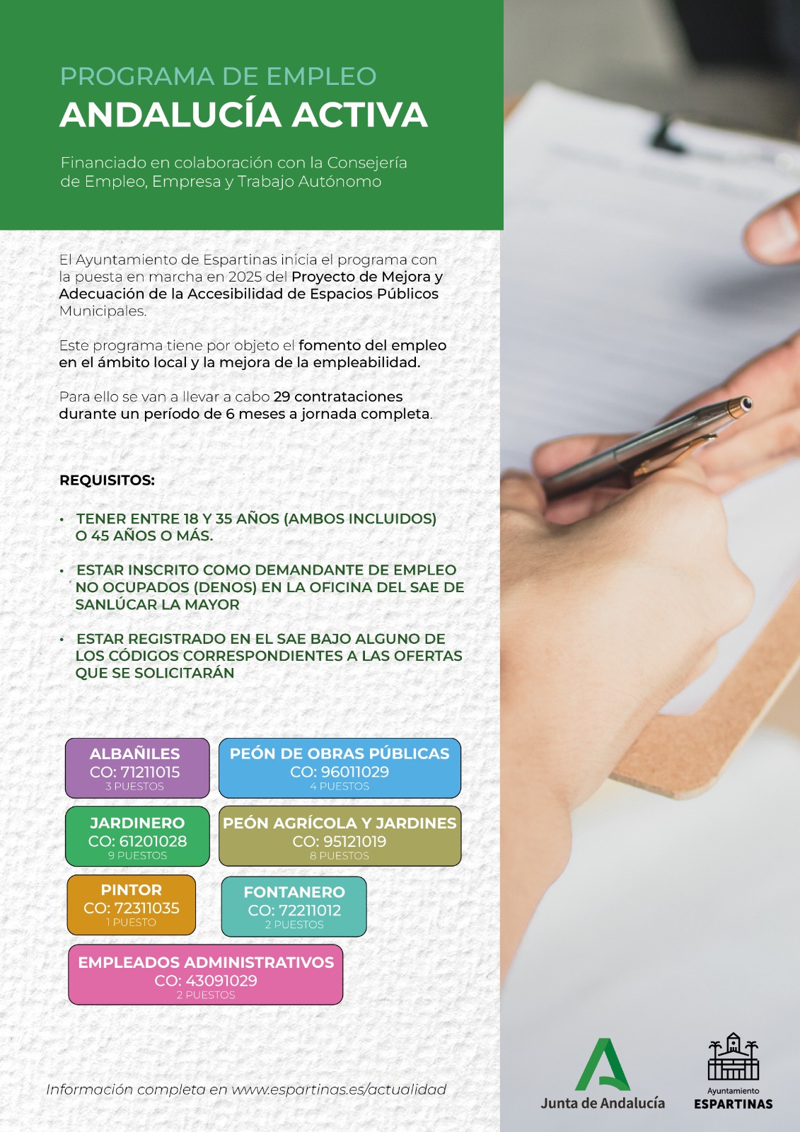 EL AYUNTAMIENTO DE ESPARTINAS PONDRÁ EN MARCHA EL PROGRAMA DE EMPLEO ANDALUCÍA ACTIVA CON LA CONTRATACIÓN DE 29 PERSONAS