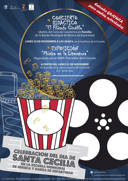 En primer lugar, el lunes 23 de noviembre se llenará de la mejor música para disfrutar en familia con un CONCIERTO DIDÁCTICO de nuestra BANDA MUNICIPAL de Música que tendrá lugar a las 20:00 horas en el Auditorio de la Escuela (C.C. Santa Ana, planta superior). Dentro del Ciclo “Conciertos en Familia”, esta agrupación que no cesa en su labor de acercar la música de una forma amena a todo el mundo, nos presenta para esta ocasión "El Filósofo Cinéfilo", un recorrido por el mundo de la música de cine a través de la visión de un personaje muy peculiar…. Como siempre habrá sorpresas que convertirán este homenaje a Santa Cecilia en una velada inolvidable.