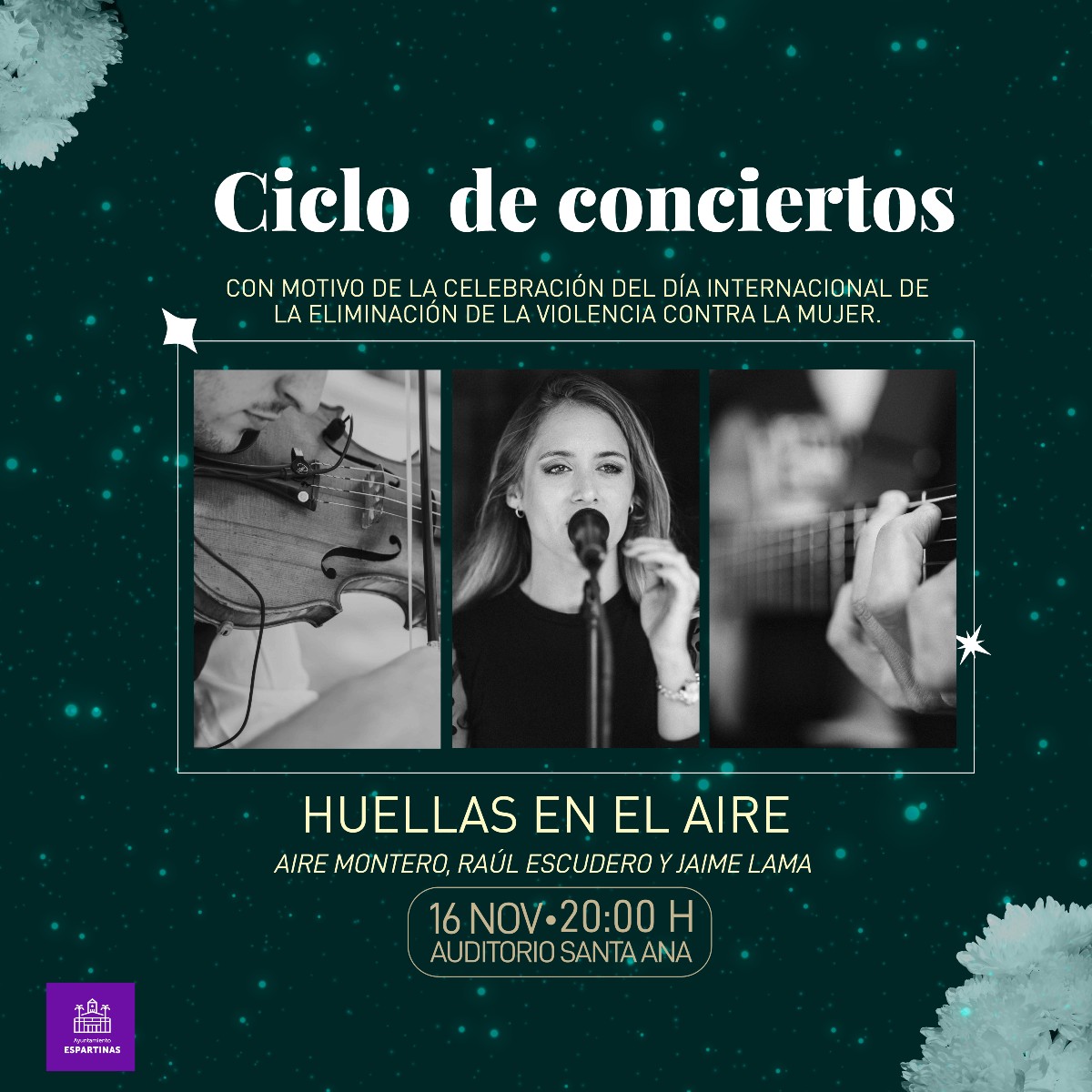 La delegación de Cultura en colaboración con la Delegación de Igualdad y Políticas Sociales del Ayuntamiento de Espartinas , organizan el concierto Huellas en el Aire, de la artista Aire Montero, acompañada de los músicos Raúl Escudero y Jaime Lama.