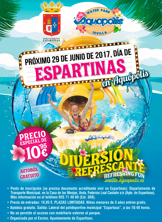 El próximo 29 de junio tendrá lugar el día de Espartinas en Aquópolis con una oferta para los vecinos de nuestra localidad: 10,95 euros cada entrada (los niños menores de 3 años entran gratis). Los interesados pueden comprar sus entradas en el Departamento de Transporte Municipal, en la Casa de las Monjas, en la avenida Federico Leal Castaño, sn. Hay que aportar documento acreditando que se vive en Espartinas. El autobús gratuito saldrá desde el lateral del polideportivo municipal Juan Antonio Ruiz "Espartaco", a las 10.40 horas.No se permite el acceso con mobiliario externo al parque.