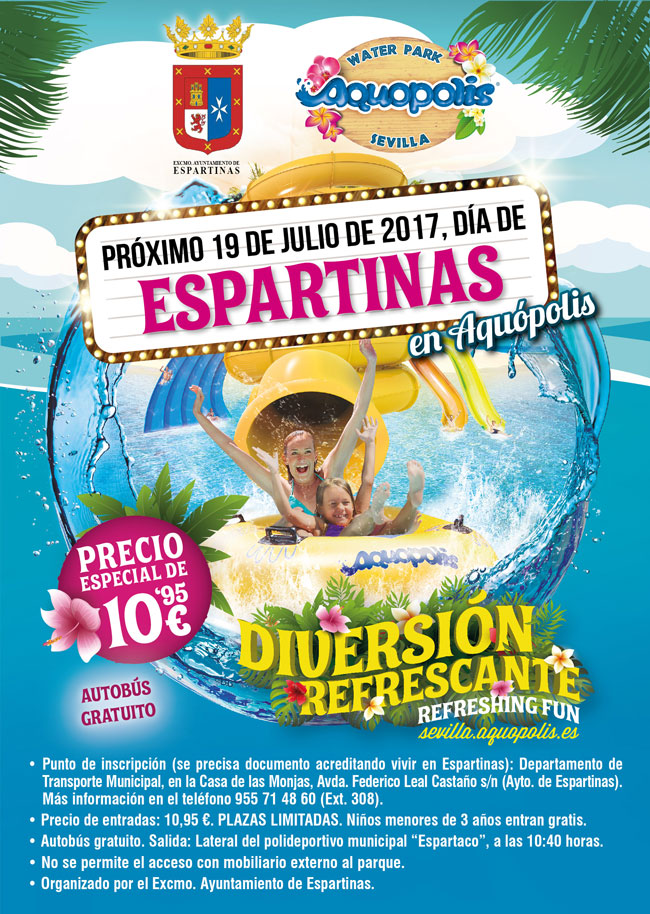 El próximo 19 de julio tendrá lugar el día de Espartinas en Aquópolis con una oferta para los vecinos de nuestra localidad: 10,95 euros cada entrada (los niños menores de 3 años entran gratis). Los interesados pueden comprar sus entradas en el Departamento de Transporte Municipal, en la Casa de las Monjas, en la avenida Federico Leal Castaño, sn. Hay que aportar documento acreditando que se vive en Espartinas. El autobús gratuito saldrá desde el lateral del polideportivo municipal Juan Antonio Ruiz "Espartaco", a las 10.40 horas.No se permite el acceso con mobiliario externo al parque.
