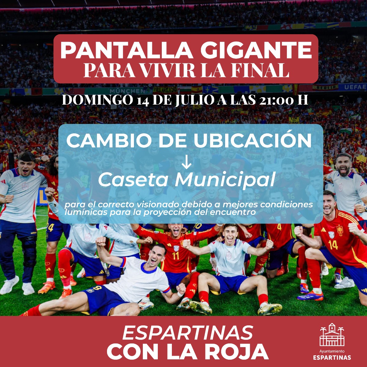 El próximo domingo 14 de julio, el Ayuntamiento de Espartinas habilitará una pantalla gigante en la Caseta Municipal del Recinto Ferial de Tablantes para que todos los vecinos/as puedan vivir la final de la #Eurocopa