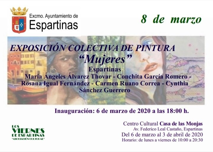 Este viernes, a las 18.00 horas, tendrá lugar la inauguración de la Exposición Coletiva de Pintura denominada "Mujeres". Cinco pintoras de la localidad nos presentan sus obras en una muestra que estará abierta del 6 de marzo al 3 de abril (horario, de lunes a viernes, de 10.00 a 20.30 horas). No pierdas la oportunidad de conocer la obra de María Ángeles Álvarez Thovar, Conchita García Romero, Rosana Igual Fernández, Carmen Ruano Correa y Cynthia Sánchez Guerrero.Recuerda, la inauguración tendrá lugar el 6 de marzo, a las 18.00 horas. Entrada libre hasta completar aforo.