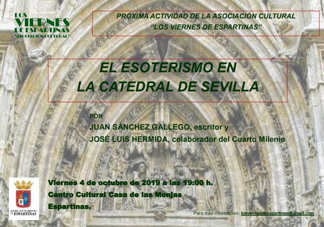 La Asociación Los Viernes de Espartinas organiza una charla con el título "El Esoterismo en la Catedral de Sevilla", que contará con la presencia del escritor Juan Sánchez Gallego y el colaborador de Cuarto Milenio José Luis Hermida.