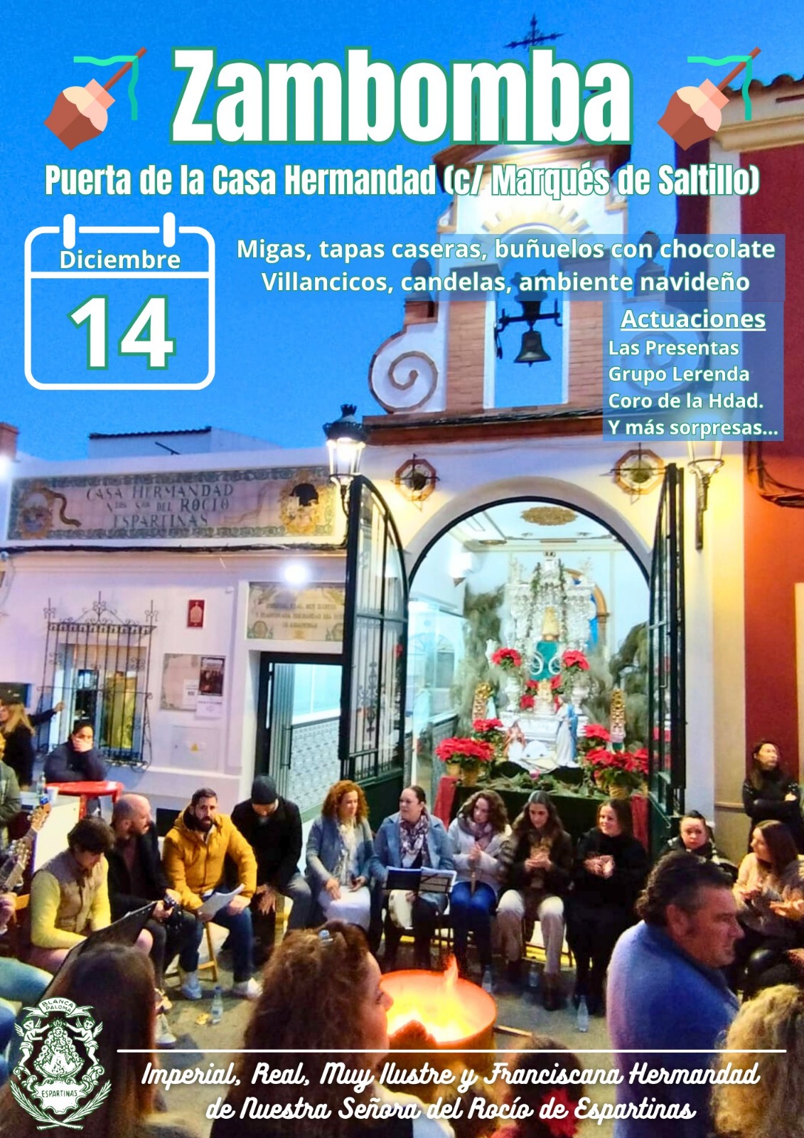 La Hermandad del Rocío organiza este sábado 14 de diciembre su Zambomba navideña, en la puerta de la casa hermandad (calle Marqués de Saltillo). Candelas, villancicos, actuaciones en directo, ambigú con migas, tapas caseras y nuestros deseados buñuelos con chocolate...