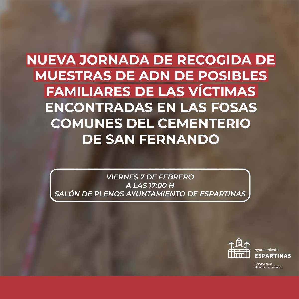 El salón de plenos del Ayuntamiento de Espartinas acoge este viernes 7 de febrero a partir de las 17.00 horas la segunda recogida de muestras de ADN a posibles familiares de víctimas encontradas en las fosas comunes del Cementerio de San Fernando de Espartinas.