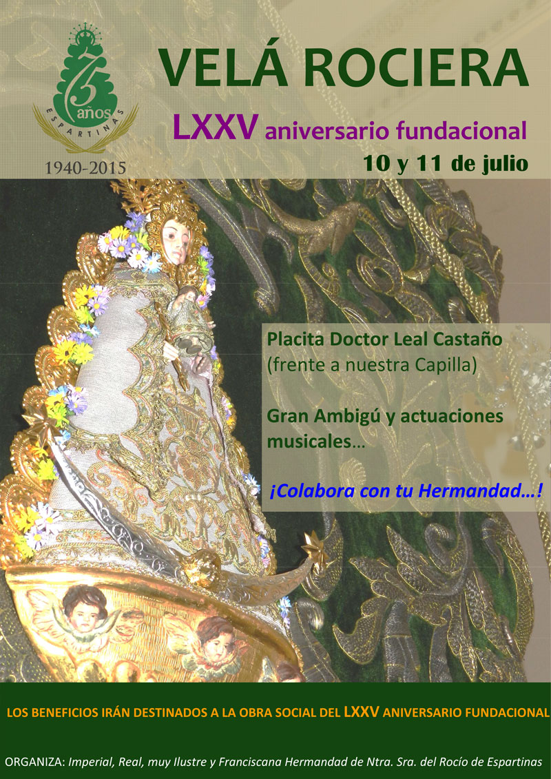 La Hermandad del Rocío de Espartinas ha organizado una Velá Rociera para los días 10 y 11 de julio con motivo de su 75 aniversario fundacional. La Velá se celebrará en la Plaza Doctor Leal Castaño, frente a la Casa Hermandad. Los beneficios se destinarán a la obra social de la hermandad.
