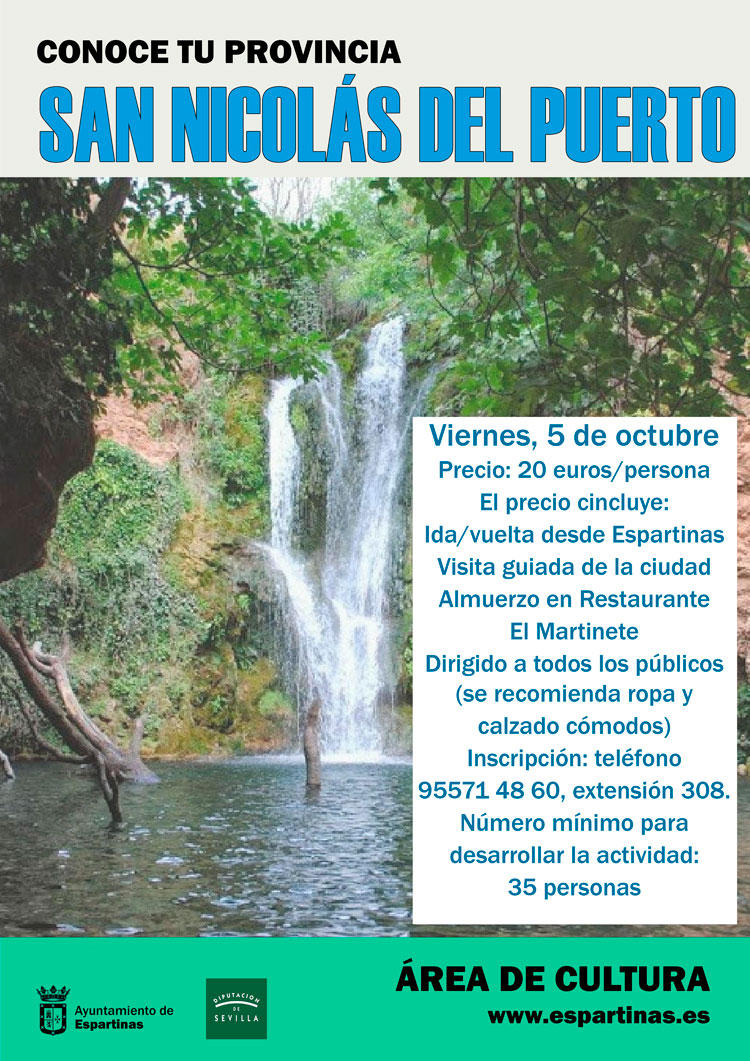 La Diputación de Sevilla y el Ayuntamiento de Espartinas te proponen una visita a San Nicolás del Puerto, que tendrá lugar el viernes 5 de octubre. El precio es de 20 euros e incluye transporte y comida en la Sierra Norte. Los interesados pueden llamar al ☎️ 955714860, extensión 308. Plazas limitadas.