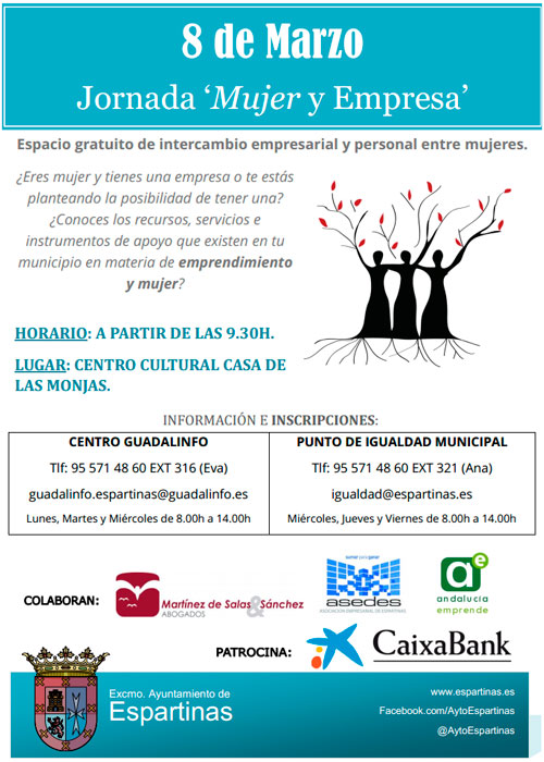 Para conmemorar el Día Internacional de la Mujer, el Punto de Igualdad Municipal, en colaboración con Red Guadalinfo, ASEDES, Andalucía Emprende (CADE), Martínez de Salas y Sánchez - Abogados y CaixaBank, organiza una jornada sobre Mujer y Empresa.