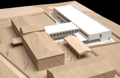 con el edificio de ampliación, se ubicará la biblioteca y un nuevo porche cubierto que proporcionará