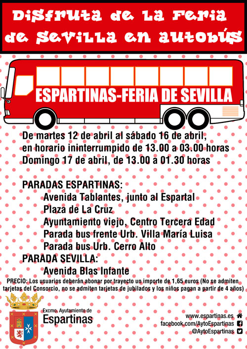 El Ayuntamiento de Espartinas pone en marcha el programa "Disfruta de la Feria de Sevilla en autobús" para facilitar el traslado de los vecinos que quieran visitar la Feria de Abril de Sevilla. El servicio estará en funcionamiento desde el martes 12 de abril hasta el domingo 17 de abril. El horario de este servicio se iniciará a las 13.00 horas con una primera salida desde la avenida de Tablantes, junto al Espartal. El autobús realizará su último trayecto desde Sevilla a las 3.00 horas de la madrugada (domingo 17 de abril, a las 1.30 horas).