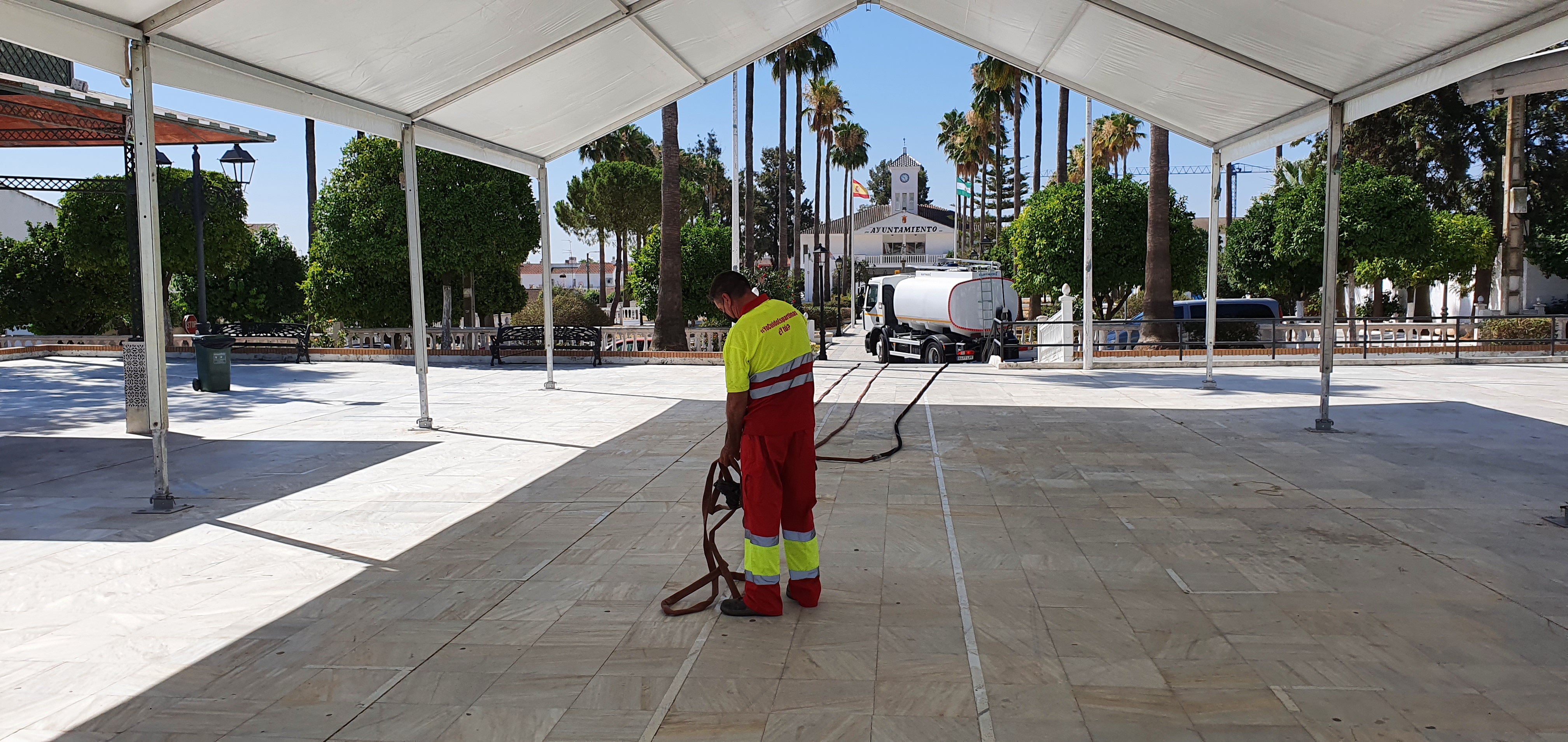 El Ayuntamiento de Espartinas está llevando a cabo la instalación de varias carpas en las Plazas del Ayuntamiento y Plaza del Avión en sus dos niveles. En total serán mil metros cuadrados de carpas que servirán para dar sombra a los vecinos y vecinas que cada jornada utilizan esa zona para el ocio y para las actividades culturales que se desarrollan en las plazas.