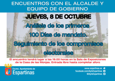 Este jueves 8 de octubre tendrá lugar el tercer Encuentro con el alcalde. En esta ocasión, el encuentro se centrará en los "100 primeros días de gobierno. Seguimiento de los compromisos electorales". Se realizará en la Sala de Exposiciones del Centro Cultural Casa de las Monjas, con entrada libre hasta completar aforo.