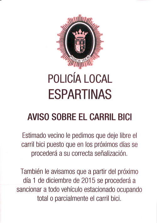 Desde la Concejalía de Seguridad Ciudadana se informa que a partir del 1 de diciembre la Policía Local de Espartinas procederá a sancionar a aquellos vehículos que esté estacionado ocupando total o parcialmente el carril bici. Se ha iniciado una campaña de información a través de la web municipal y redes sociales del Ayuntamiento así como reparto de folletos informativos sobre este hecho.