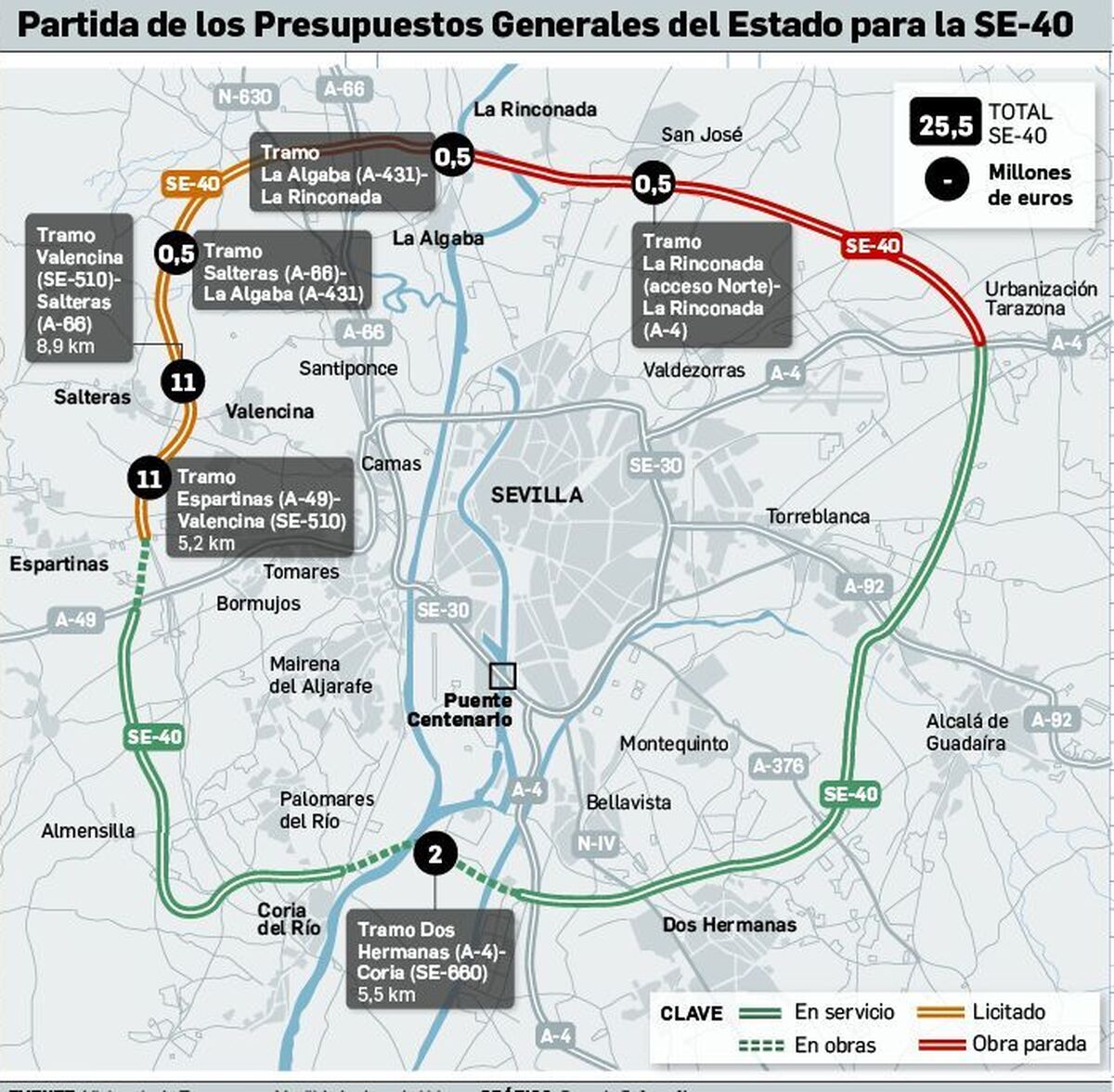Los Presupuestos General del Estado para 2023 recogen una inversión de 11 millones de euros para el tramo comprendido entre Espartinas-Valencina de la Concepción. Esta cantidad servirá para continuar la obra de la SE 40 dirección Valencina de la Concepción y permitirá la conexión de Espartinas a esta vía rápida a través de la A8076