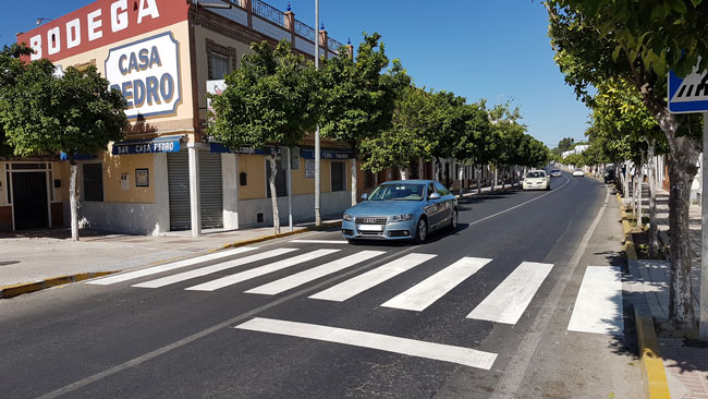 La Delegación de Fomento, a instancias de la Delegación Urbanismo del Ayuntamiento de Espartinas, ha procedido al pintado de un nuevo paso de cebra en la avenida Alcaldesa María Regla Jiménez, a la altura de la Plaza de la Cruz. Esto permite el paso, sin peligro, de los peatones por la antigua travesía de Huelva, una zona con gran volumen de vehículos, facilitando el acceso a los comercios de la zona.
