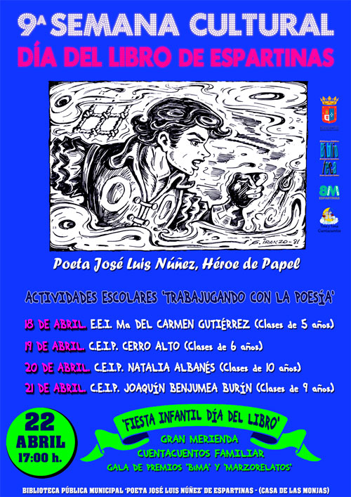 Espartinas celebra del 18 al 22 de abril la novena edición de la Semana Cultural 'Día del Libro', dedicada al poeta espartinero José Luis Núñez. La Concejalía de Cultura, a través de la Biblioteca Pública Municipal que lleva su nombre ha organizado una veintena de actividades de dinamización a la lectura para todos los colegios públicos de la localidad, donde se espera una participación de más de 400 alumnos. El contenido de cada sesión está conformado por dos propuestas dirigidas a escolares de entre 4 y 10 años: la 'Pequexposición José Luis Núñez, nuestro poeta' (que versará sobre su vida y obra) y 'Trabajugando con la poesía' (que constituirá una primera toma de contacto con la poesía mediante juegos de palabras y dibujos).