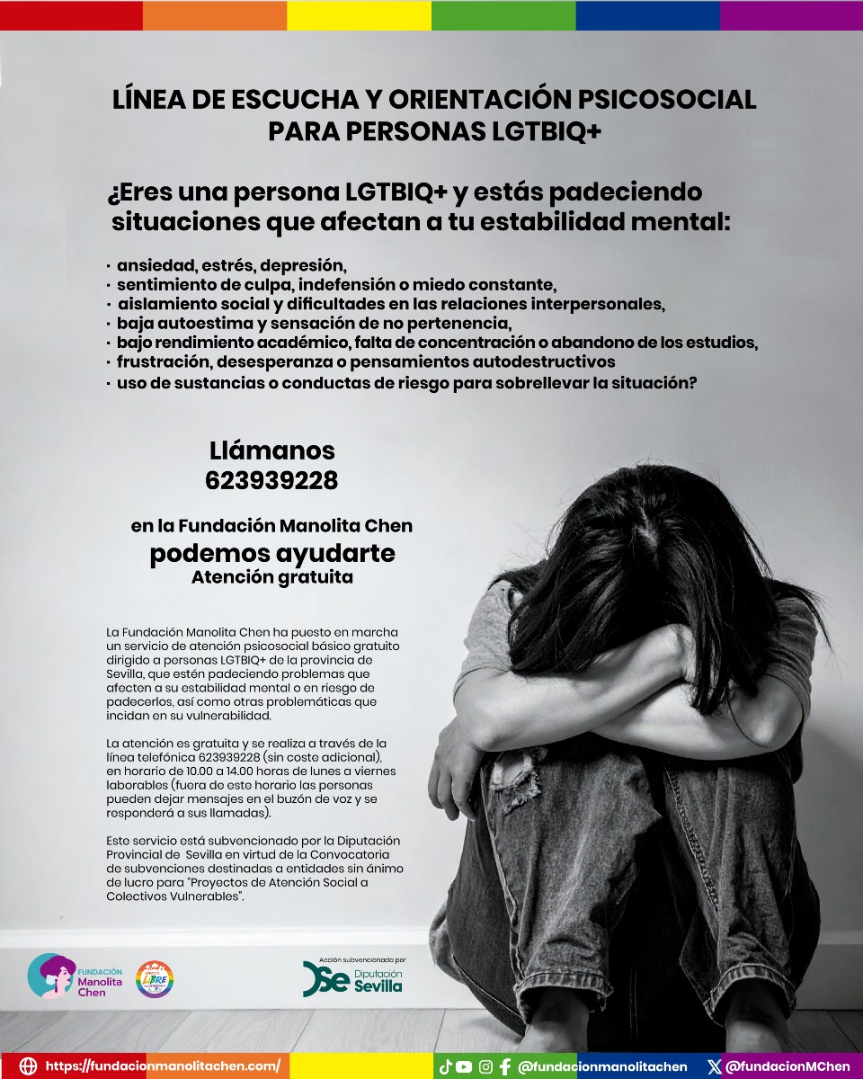 Desde la Fundación Manolita Chen se ha puesto en marcha un servicio de atención psicosocial básico gratuito dirigido a personas LGTBIQ+ de la provincia de Sevilla, que estén padeciendo problemas que afecten a su estabilidad mental o en riesgo de padecerlos, así como otras problemáticas que incidan en su vulnerabilidad.