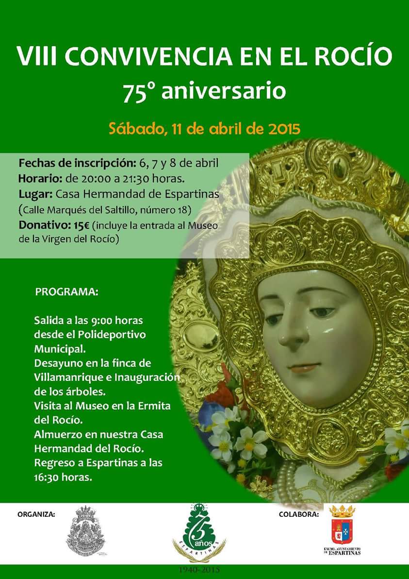 La Hermandad del Rocío de Espartinas organiza la VIII Convivencia en el Rocío, el sábado 11 de abril. La salida tendrá lugar a las 9.00 horas en el Polideportivo Municipal Juan Antonio Ruiz Espartaco. Posteriormente habrá un desayuno en la finca de Villamanrique con la inauguración de los árboles plantados en la parcela; Visita al Museo en la Ermita del Rocío y almuerzo en la Casa Hermandad. El regreso será a partir de las 16.30 horas.