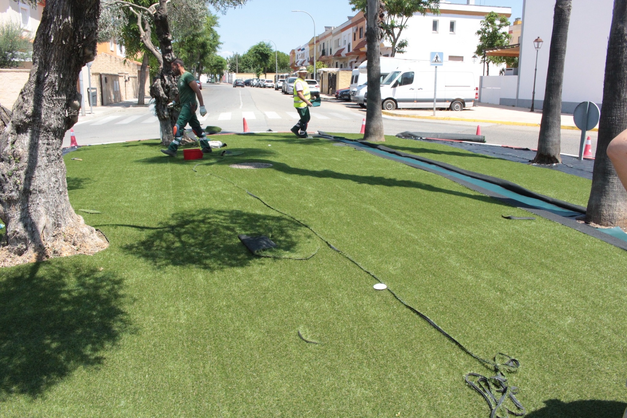 Ya ha concluido el desbroce y limpieza de las mismas y se está colocando mallas antihierba y césped artificial. Las rotondas se rematarán con la colocación de chino blanco y plantas y el pintado de bordillo.