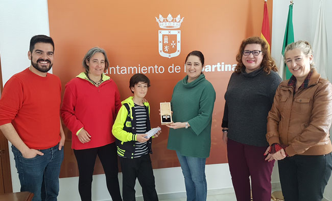 El Equipo de Gobierno del Ayuntamiento de #Espartinas ha recibido en la mañana de hoy a Dimas Abou Rizzo Rey, flamante ganador del Concurso Literario BiMA 2018 de la Red de Bibliotecas Municipales del Aljarafe en categoría alevín. El acto ha tenido lugar en el despacho de la alcaldesa, Olga Hervás, quien ha mostrado su orgullo porque este espartinero amante de las letras y la gimnasia rítmica haya ganado este prestigioso premio. En el acto, Dimas ha entregado a la concejal de Cultura, Araceli Pila Balanza, una copia del cuento ganador. Por su parte, la alcaldesa ha entregado un pin y un pisacorbata institucional del Ayuntamiento de Espartinas. Enhorabuena por ese premio Dimas.