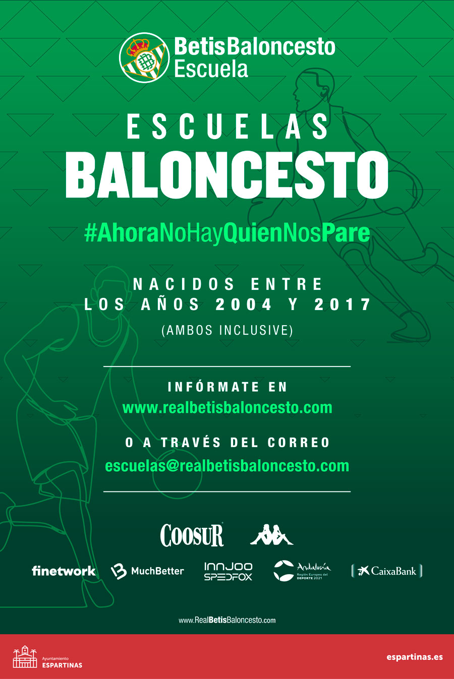 En caso de duda, sólo debéis escribir al correo escuelas@realbetisbaloncesto.com o si se trata de alguna incidencia relativa a inscripción o pago de cuotas, podéis poneros en contacto a través del correo deportes@espartinas.es o en el teléfono 955714860 extensión 2501 y 2502.