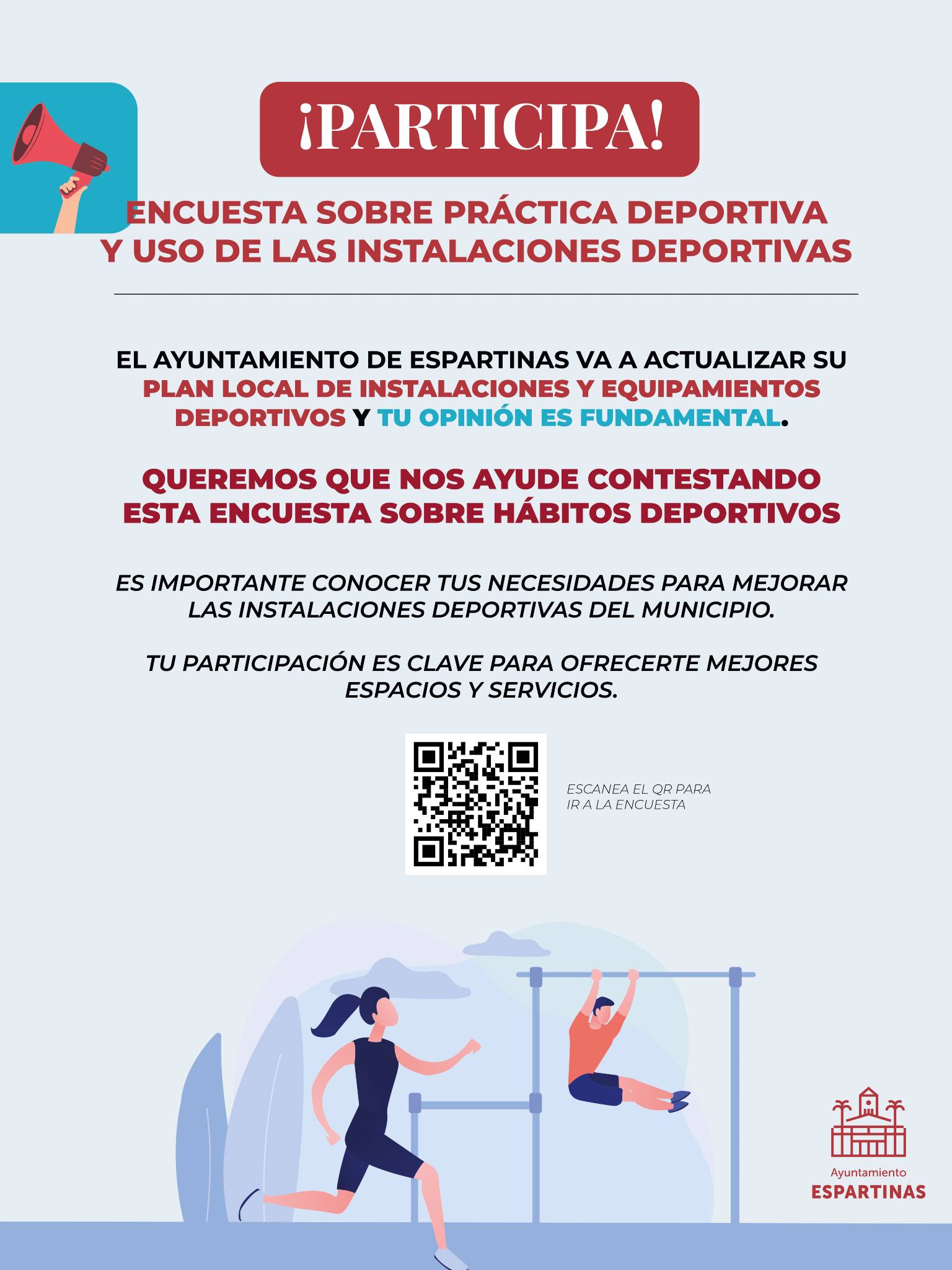 El Ayuntamiento de Espartinas va a actualizar su Plan Local de Instalaciones y Equipamientos Deportivos y tu opinión es fundamental. Queremos que nos ayude contestando esta encuesta sobre hábitos deportivos.