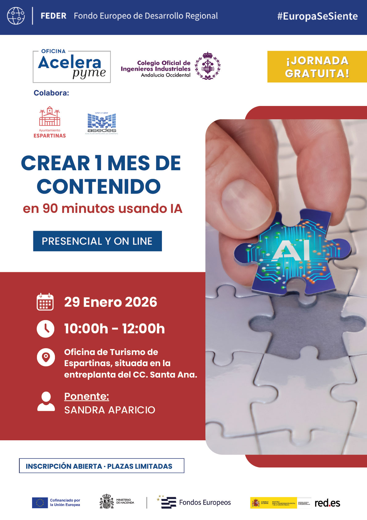 Desde Acelera Pyme Sevilla COIIAOC , el Ayuntamiento de Espartinas y la asociación de empresarios ASEDES, le invitamos a la jornada GRATUITA de “CREAR 1 MES DE CONTENIDO EN 90 MINUTOS USANDO IA” el jueves 29 de enero. A las 10h comenzará la jornada impartida por Sandra Aparicio.
