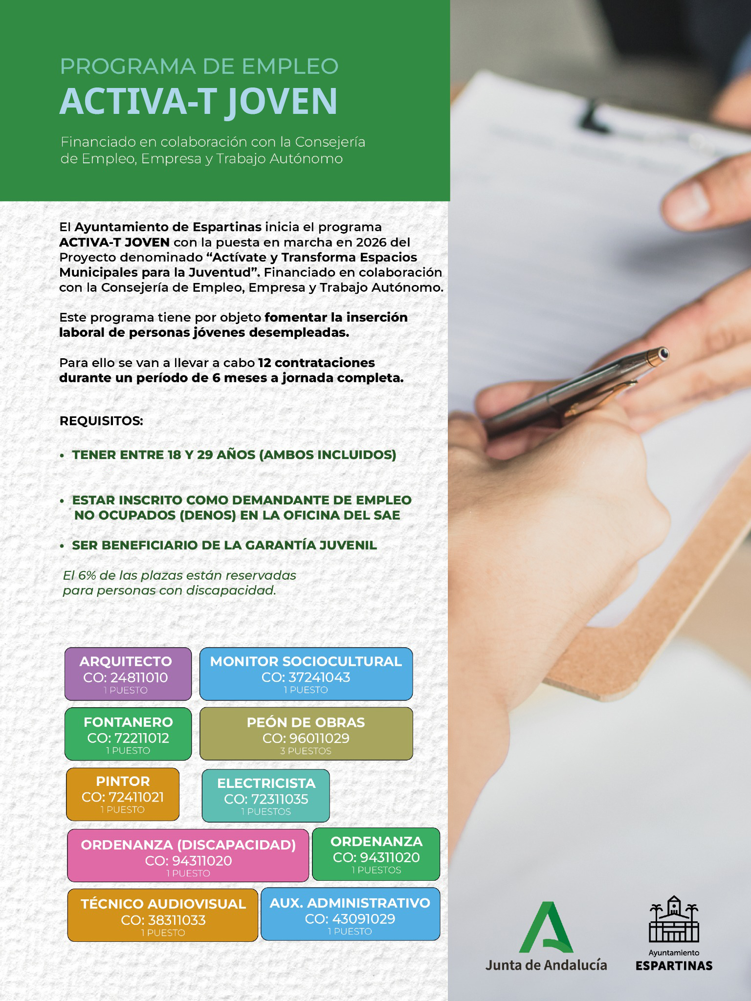 El Ayuntamiento de Espartinas inicia en 2026 el programa ACTIVA-T JOVEN, con la puesta en marcha del proyecto “Actívate y Transforma Espacios Municipales para la Juventud”, financiado en colaboración con la Consejería de Empleo, Empresa y Trabajo Autónomo de la Junta de Andalucía