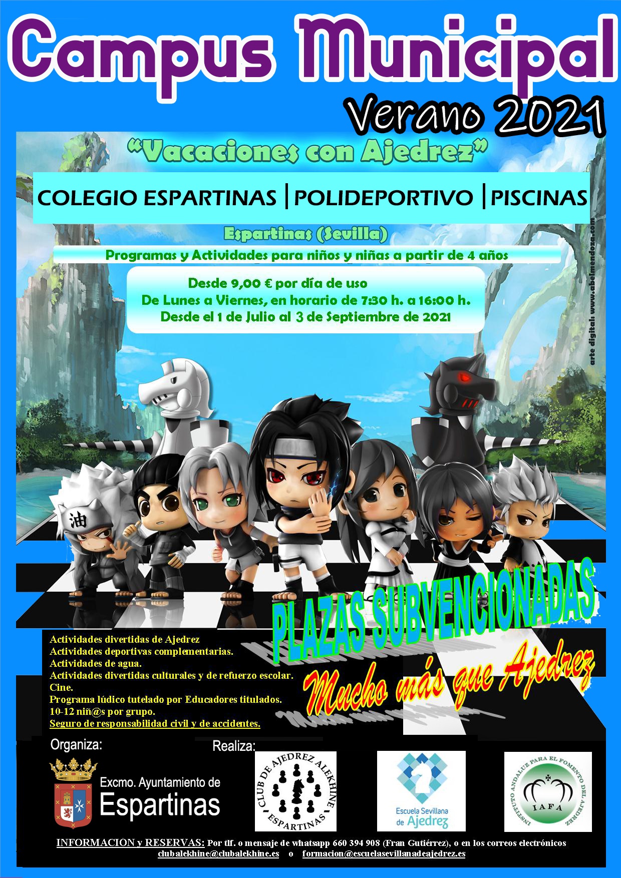 El Ayuntamiento de Espartinas organiza su Campus de Verano gestionado por el Club Ajedrez Alekhine, del 1 de julio al 3 de septiembre. Tendrá como sede el Colegio Espartinas, el Polideportivo Municipal y la piscina de verano. El horario será de 7.30 a 16.00 horas.