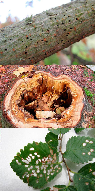Galeruca: Plaga. Otro barrenillo que ataca el haz y envés de la hoja. El continuo ataque de esta plaga, deja desprovisto al árbol de su función principal, la fotosíntesis.