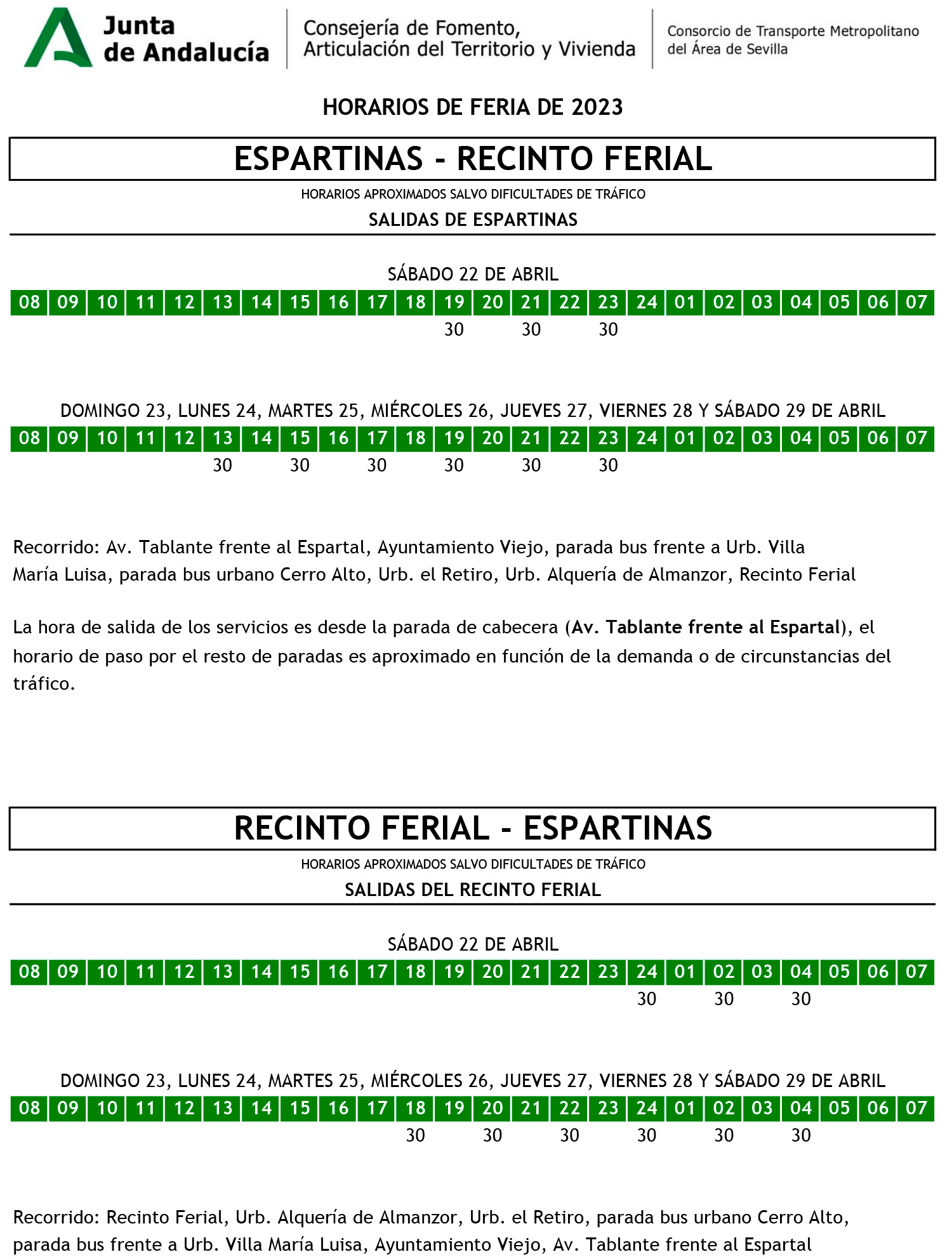 Información Consorcio de Transporte Metropolitano del Área de Sevilla sobre los servicios especiales de autobuses para la Feria 2023. La frecuencia y los horarios de los autobuses son decisión del Consorcio de Transporte.