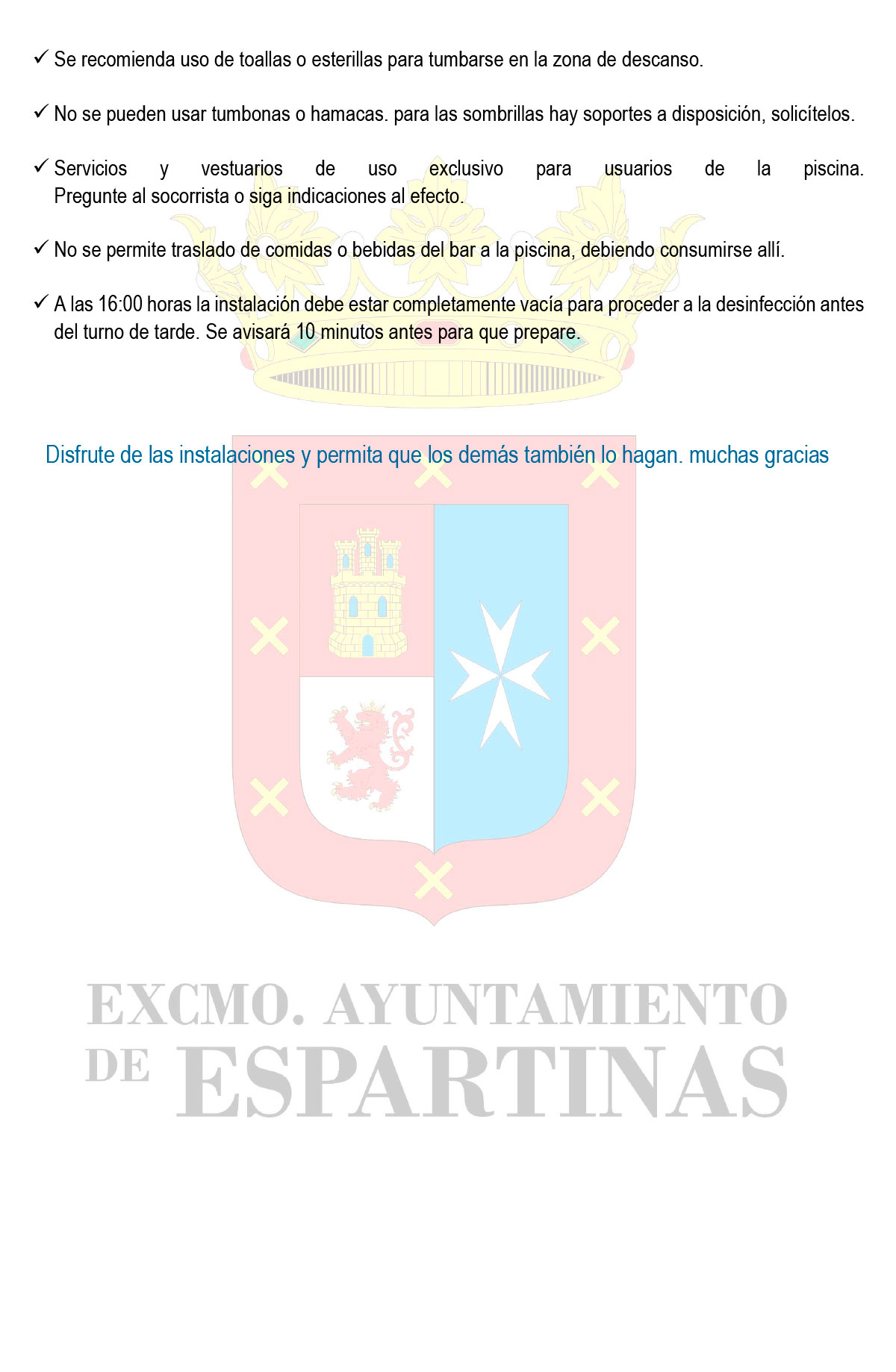 Os solicitamos que se cumpla en todo momento las normas de uso de las instalaciones para logar entre todos un baño seguro. Gracias por vuestra colaboración.