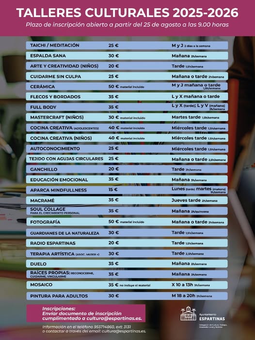 A partir del 25 de agosto, rellena tu inscripción y envíala a cultura@espartinas.es Date prisa, plazas limitadas.